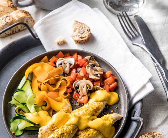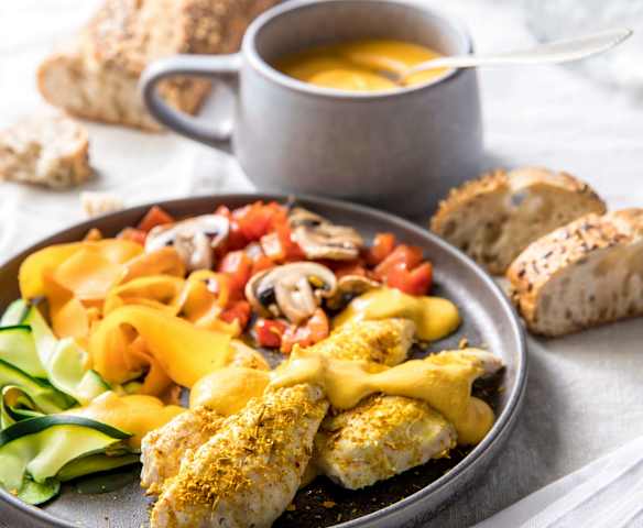 Poulet au curry, tagliatelle de légumes et velouté au lait de coco